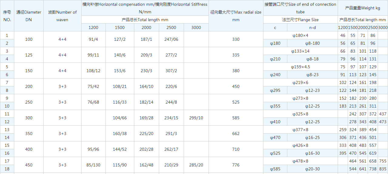 | 序號NO. | 通徑Diameter DN | 波數(shù)Number of waven | 橫向補償Horizontal compensation mm/橫向剛度Horizontal Stiffness N/mm | 徑向很大尺寸Max radial size mm | 接管端口尺寸Size of end of connection tube | 產(chǎn)品重量Weight kg | |||||||||