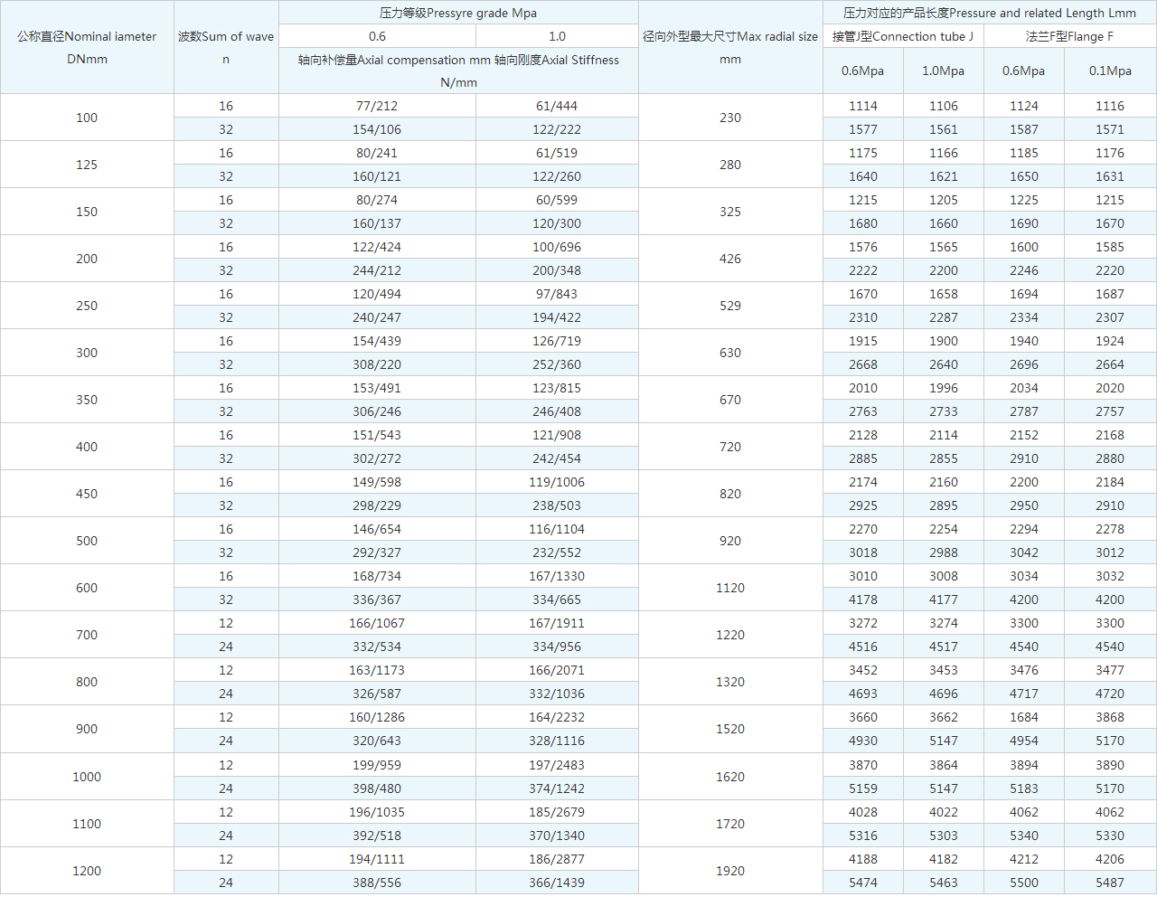 | 公稱(chēng)直徑Nominal iameter DNmm | 波數(shù)Sum of wave n | 壓力等級(jí)Pressyre grade Mpa | 徑向外型很大尺寸Max radial size mm | 壓力對(duì)應(yīng)的產(chǎn)品長(zhǎng)度Pressure and related Length Lmm | ||||