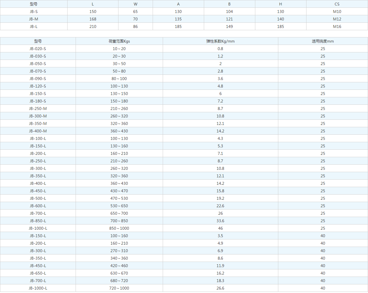 | 型號(hào) | 荷重范圍Kgs | 彈性系數(shù)Kg/mm | 適用撓度mm |