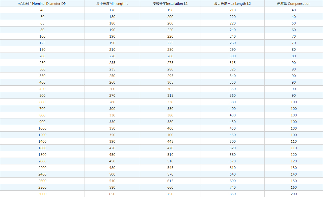 | 公稱通徑 Nominal Diameter DN | 很小長(zhǎng)度Minlength L | 安裝長(zhǎng)度Installation L1 | 很大長(zhǎng)度Max Length L2 | 伸縮量 Compensation |